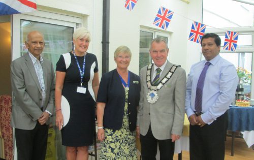 l to r Sandy Siva (Owner) , Tania Carter (West Sussex Care and business support team), Cllr Christine Mainstone (Mayoress), Cllr Bob Mainstone (Town mayor), Binoy John (Manager)